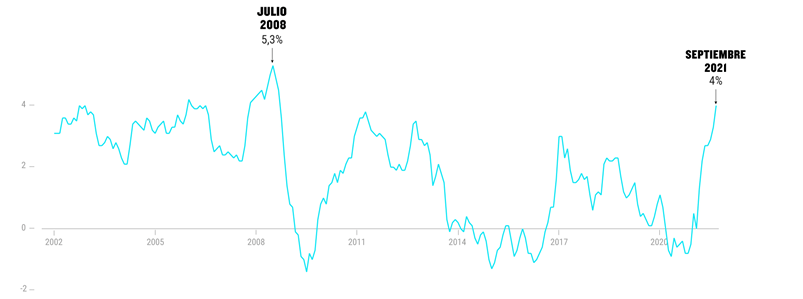 El FMI avisa de que la inflación se mantendrá en niveles elevados hasta mediados de 2022. Esta es, en gran parte, la razón que explica que la mayoría de los recortes de previsiones este año se trasladen al que viene. La tasa interanual de inflación de España en septiembre fue del 4%.