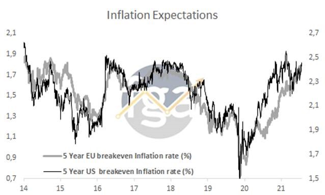 A pesar de que la inflación actual en EE.UU. se sitúe en el 5,4% y en la Eurozona del 3% (España 3,1%), ni la Reserva Federal, ni el BCE tienen la mínima intención de mover los tipos de interés desde los niveles actuales: EE.UU. 0%-0,25%, Eurozona -0,5%. La excusa para mantener los tipos de interés en los ridículos niveles actuales es que la actual inflación es «transitoria».