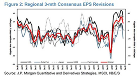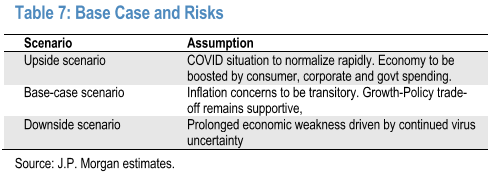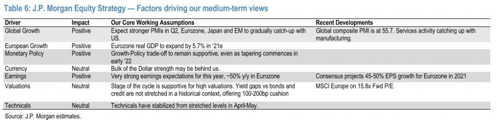 JPMorgan espera que la temporada de beneficios dé algo de margen a los activos de riesgo durante las próximas semanas. Los analistas de JPMorgan creen que el movimiento de los bonos soberanos de la semana pasada es de carácter técnico y temporal, ya que ven la inflación alta en el futuro más cercano. Esta inflación está poniendo presión sobre los bancos centrales para que retiren los estímulos, no sólo porque la inflación este por encima de los objetivos sino porque esta inflación deprime aún más los tipos reales redoblando la apuesta de las políticas expansivas. Esta situación parece haber cogido a los bancos centrales a pie cambiado y hace que parezca que van por detrás de la curva de tipos, más aún de lo que lo parecía antes si cabe.
