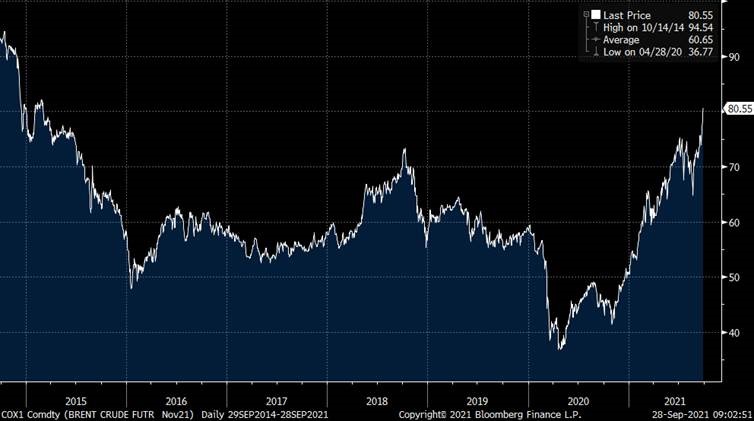 Las subida del precio del petróleo, que llegaba a tocar los 83,8 dólares por barril el West Texas y 86 dólares por barril barril el Brent, abría también los miedos de una inflación alta durante más tiempo del previsto, y con ello veíamos más presiones en la deuda soberana estadunidense, con el bono a 2 años disparándose hasta el +0,43% y el 10 años superando ligeramente niveles de 1,60% de TIR.