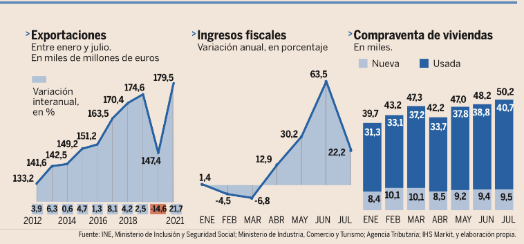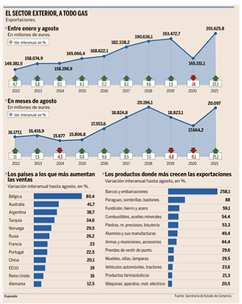 Por ahora, España ya vende a otros países más que en 2019, y eso que ese año las exportaciones batieron su octavo récord consecutivo. Entre enero y agosto de 2021, España vendió 201.625 millones de euros, un 4% más que en 2019, que rebasa niveles prepandemia y marca un nuevo máximo histórico. La comparativa con 2020 es todavía más llamativa, con un aumento del 22%, aunque poco representativa, al tratarse de un año marcado por confinamientos, restricciones y parones de actividad.