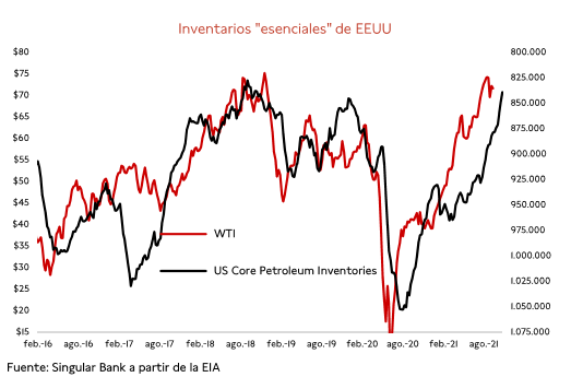 Ayer la Agencia Internacional de la Energía revisó a la baja la demanda esperada de petróleo para 2S21 en 500.000 barriles al día (vs -120.000 barriles en 1S21) como consecuencia de las restricciones impuestas tras la expansión de la variante Delta. La AIE afirma en su boletín mensual que el mercado petrolero puede volver a registrar superávit en 2022 si la OPEP+ continúa deshaciendo sus recortes y los productores que no participan en dicho acuerdo aumentan su oferta en respuesta a unos precios más altos. Un llamamiento a una reducción de precios que contrasta con la visión más positiva de la OPEP que en su informe mensual ha mantenido sin cambios el incremento esperado de demanda de 6 millones de barriles diarios en el año 2021 y 3,3 millones en el año 2022 superando los 100 millones de barriles al día.