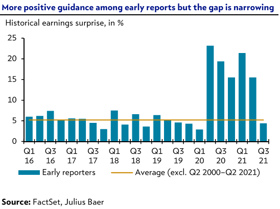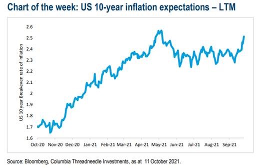 En cuanto a la temporada de resultados de las compañías del tercer trimestre del año en Estados Unidos el consenso de analistas espera que los beneficios empresariales del S&P 500 hayan crecido un 27%, un nivel muy saludable, aunque menor que el impresionante 92% del trimestre anterior. Dado el aumento en el coste de los aprovisionamientos y las disrupciones vistas en las cadenas productivas, los analistas prestarán especial atención a la evolución del margen de beneficios, donde tecnología y salud deberían sobresalir.