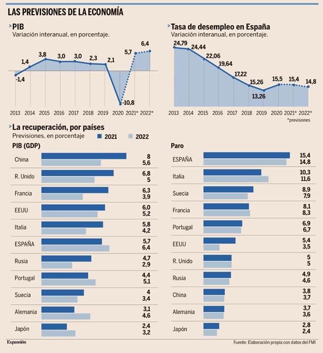 Esto es algo de lo que también advirtió elBanco de España hace algunas semanas, poco antes de recortar también sus previsiones para España al 6,2% este año, todavía bastante más optimista que el FMI. “La falta de material está impidiendo que empresas manufactureras de la zona euro puedan responder plenamente a la rápida recuperación de la demanda, lo que podría lastrar el proceso de recuperación económica”, avisó el organismo. El Gobierno ha mantenido para este año un crecimiento del 6,5%, y del 7%, para 2022.