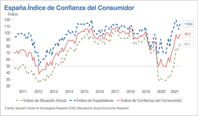 La confianza del consumidor español tocó casi mínimos durante la crisis covid, en la zona de 50, frente a niveles de 45 en lo peor de la gran recesión (2012). Desde entonces se generó una intensa recuperación, recuperación que experimentó una ligera caída en el mes de febrero de 2021, caída muy señalada por muchos medios. Desde entonces la confianza, medida por el índice de confianza del consumidor (ICC) que sigue mensualmente el Centro de Investigaciones Sociológicas, ha mostrado subidas continuadas hasta alcanzar ayer, tras subir siete puntos, niveles cercanos a 100, prácticamente el doble que los de 2020 y en máximos históricos junto con episodios entre 2015 y 2017(tabla inferior).