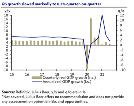 El crecimiento económico chino se desaceleró de manera importante en el tercer trimestre, lastrado por los rebrotes del virus, recortes de producción y energéticos y el desapalancamiento del sector inmobiliario. A excepción del Covid, la mayoría de estos factores se van a mantener en los próximos meses, por lo que Julius Bäer rebajaba esta semana nuestra expectativa de crecimiento al 7,7% este año y al 4,9% el que viene frente al 7,9% y 5% que esperaban anteriormente.