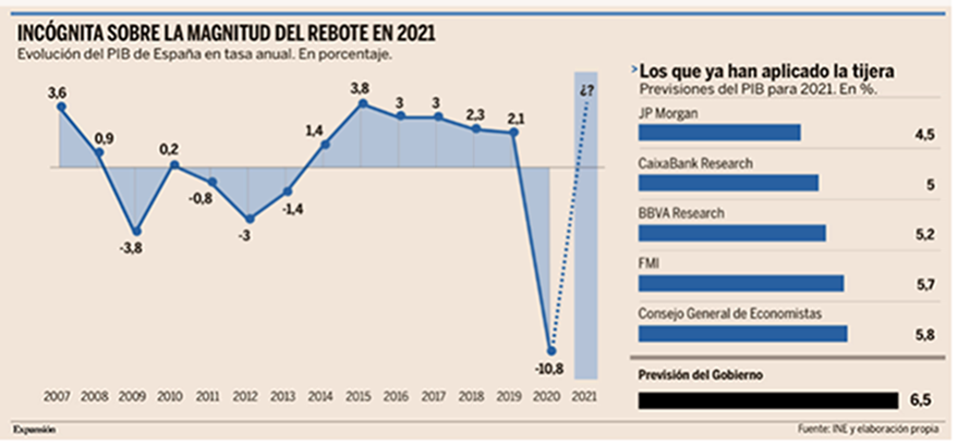 BBVA Research ha sido el más reciente en enfriar la euforia gubernamental, pero no el primero ni tampoco será el último. Abrió la veda JPMorgan, firma que poco después de la revisión del INE redujo al 4,5% su pronóstico para España desde el 6,3% anterior, un súbito y drástico empeoramiento que representa la predicción más pesimista hasta la fecha. Pero el mayor baño de agua fría provino, por su peso como referente macroeconómico internacional, del FMI, que rebajó del 6,2% al 5,7% su pronóstico de crecimiento para España en 2021, aunque a cambio elevó al 6,4% el de 2022. A estos tijeretazosse añaden los de CaixaBank, que sitúa el alza del PIB en el 5% este año frente al 6,3% previo, y el del Consejo General de Economistas, que cifra el crecimiento en el 5,8% versus el 6,3% anterior. Y está por llegar el ajuste del Banco de España, que ya anunció que revisará sus estimaciones tras la rectificación del INE.