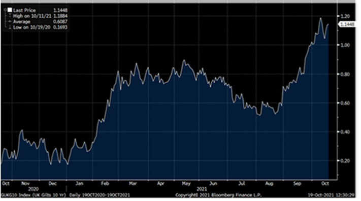Al igual que en casi todas las economías los datos de inflación han ido repuntando en Reino Unido por los problemas de suministros y energéticos en un contexto de fuerte demanda tras la apertura post Covid19. Dichos problemas están lejos de solventares y la normalización en sectores de ocio y restauración apuntan a que la inflación todavía no habría tocado techo y que en todo caso se mantendrá alta hasta el segundo trimestre del 2022. A lo anterior se suma el repunte de salarios y el de los precios de la vivienda que ya se sitúan muy por encima de los niveles pre-pandemia y de su tendencia de largo plazo. Mientras, las expectativas de subidas de tipos de interés a 1 año habían ido repuntando gradualmente siguiendo la estela de la inflación pero el cambio de sesgo en el mensaje del Banco de Inglaterra (BOE) desde mediados de septiembre disparó las expectativas de alzas de tipos hasta descontar casi 4 subidas de 25 puntos básicos hasta mediados de 2022. En 2014 y 2017-2018 el mercado también reaccionó a las expectativas de subidas del Banco de Inglaterra descontando entre 25 y 50 puntos básicos de subidas en exceso.