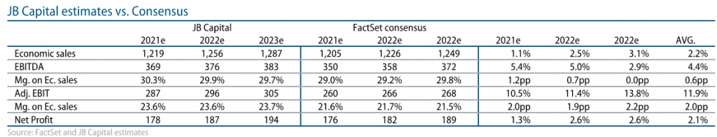 Para 2021 indican que crecerán en EBITDA a una tasa del +8%/+12% y que este ritmo será inferior al crecimiento LfL en ventas por mayor equilibrio en volúmenes/precios y mayores costes de materias primas.