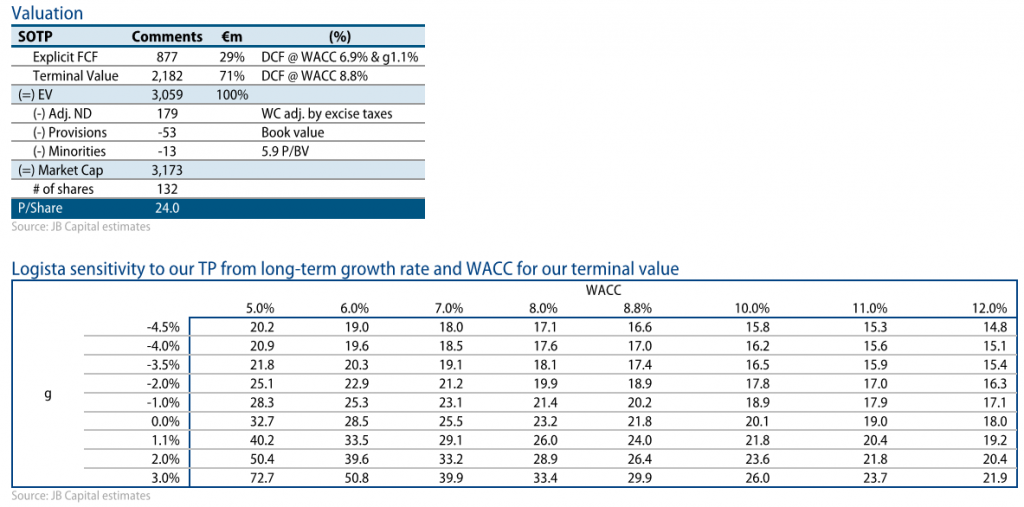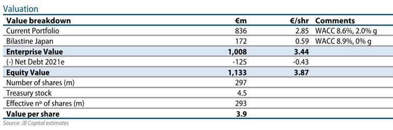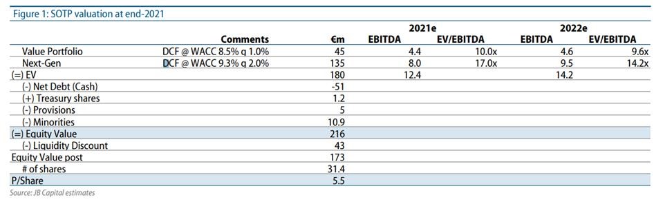 Los analistas de JBCapital hacen una valoración mediante suma de partes (la compañía tiene dos principales áreas de negocio: Value Portfolio y Next-Gen), y obtienen una valoración de 5,50 euros por acción (20% de potencial al nivel actual de mercado). La valoración la consideramos conservadora ya que el coste medio ponderado de capital que aplican nos parece algo elevado. Lo interesante de la compañía es que tiene una posición de caja de casi 52 millones de euros, lo que supone el 40% de su capitalización, lo cual le da un riesgo muy limitado de caídas, de hecho caídas de la acción nos harán incrementar la posición que tenemos en la SICAV.