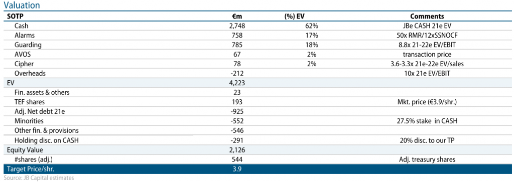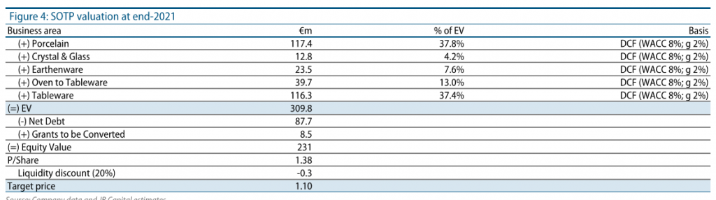 Esta semana JBCapital ha actualizado su valoración tras esta negociación y después de una valoración mediante suma de partes obtienen un precio objetivo de 1,1 euros por acción (potencial del 16% desde el nivel de mercado), es una valoración muy conservadora, en nuestra opinión, para nosotros la compañía tendría un valor intrínseco de entre 1,20 y 1,30 euros por acción.
