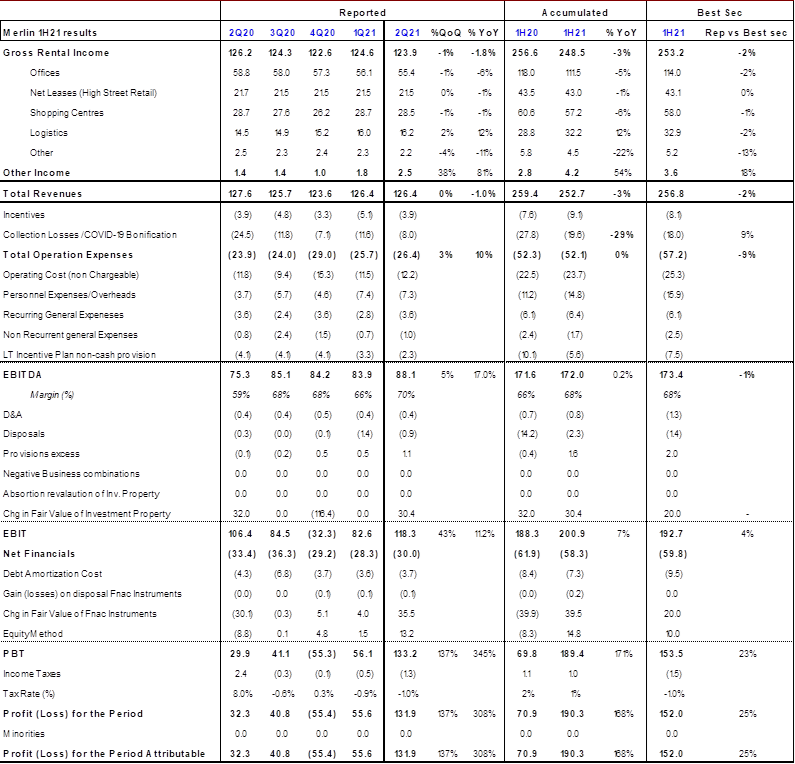 Los resultados de Merlin Properties han estado totalmente en línea con las estimaciones del consenso de analistas tanto en ingresos por rentas, que caen un -3% interanual, como en EBITDA recurrente, que se reduce en la misma proporción y crece un +14% en 2T21 vs 2T20. El beneficio operativo supera los 129 millones de euros, -3,8% interanual, lo que supone un FFO de 0,27 euros por acción, 0,26 eur/acc.en términos ajustados, bien encaminado para cumplir con la guía para final de año de 0,56 euros por acción.