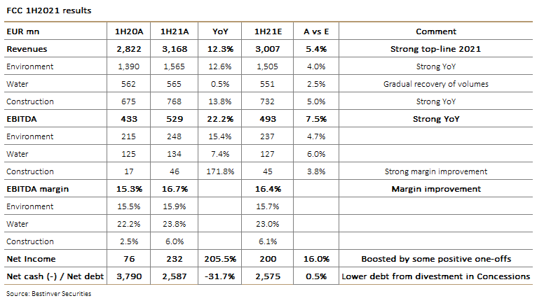 Publicó también unos resultados muy fuertes el pasado martes. Con un Beneficio Neto en el 1S21 de 232 millones de euros frente a los 76 millones del 1S20 y por encima de lo esperado por los analistas que esperaban 200 millones. FCC tuvo unos ingresos en el semestre de 3.168 millones de euros (+12% internual) con una muy positiva evolución en todas las divisiones. El área medioambiental alcanzó los 1.565 millones de euros de ingresos (+13% de crecimiento anual). El EBITDA alcanzó los 529 millones de euros (+22% vs 1S20) y muy por encima de los 493 millones que esperaban los analistas.