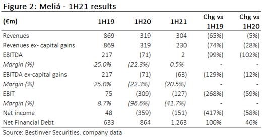 Los resultados de Meliá incluyen la venta y contrato de gestión de 8 hoteles anunciado a finales de junio que ha aportado 74,5 millones de euros en ingresos y +64 millones en EBITDA. Excluyendo estos impactos, tanto los ingresos como el EBITDA superaron previsiones de los analistas, Ingresos (+17% vs +9% vs consenso y 32% ingresos 2T19) y EBITDA -11,3 millones de euros (vs -34 millones de euros que esperaba el consenso y desde 124 millones en 2T19). En Hoteles, ingresos 150 millones de euros (-70% vs 2T 19) con Propiedad y Alquiler 128 mln eur (-69% interanual), Gestión 19 millones de euros (-76% interanual) y otros 3 millones (15 millones 2T19). La deuda neta se amplió en 21 millones de euros frente al 1T21 hasta 2.768 millones de euros (+8% vs +2% consenso) teniendo en cuenta la operación de venta y contrato de gestión de 8 hoteles con un impacto en caja neta de 175 millones de euros. Destaca favorablemente que el consumo de caja mensual se ha reducido en el 2T21 hasta -12,5 millones, si bien en 2T21 Meliá recibió 18,7 millones por parte del gobierno alemán. La compañía cuenta con una liquidez de 405 millones de euros a finales de junio, similar a marzo (230 millones) excluyendo la entrada de 175 millones en caja por la venta de activos. La directiva ya ha refinanciado los vencimientos de deuda del 2021, aunque tendrá que refinanciar los de 2022 (119 millones).