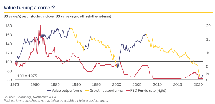 En lo que llevamos de año se está produciendo un mejor comportamiento de los sectores más “value” de las Bolsas frente al resto de sectores, y las compañías y sectores más “growth” son las que peor se están comportando en lo que llevamos de 2021, después de llevar más de una década comportándose mucho mejor que el resto.