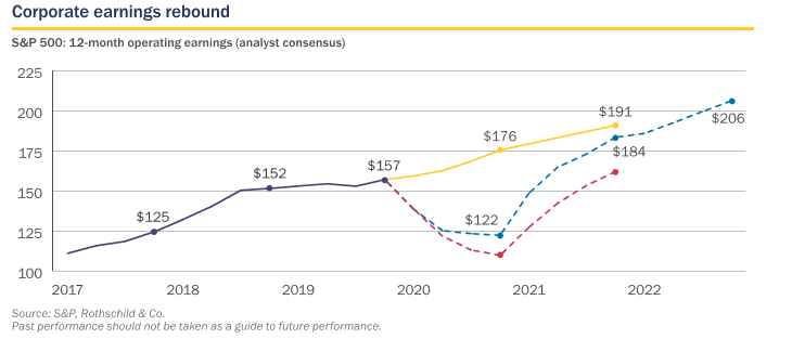 En 2019 los resultados estimados por el consenso de analistas para todo el año para el S&P 500 era de 157$ por acción, en 2020 los analistas bajaron sus expectativas a 122$, y a mitad de año bajaron estas a 110$, para el 2021 las expectativas de los analistas de consenso esperan unos ingresos para todo el año de 184$ por acción (muy por encima del nivel anterior al Covid-19 de 152$) y para el 2022 esperan que los ingresos de las compañías del S&P 500 sean de 206$