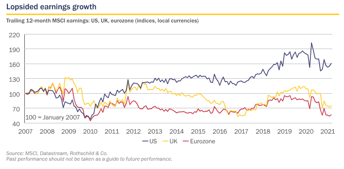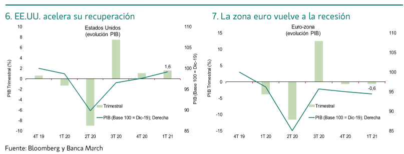 En Estados Unidos el PIB del 1T21 creció un 1,60% trimestral. Con ello, al cierre del 1T21, la economía de Estados Unidos prácticamente ya ha recuperado los niveles de PIB previos a la pandemia. Mientras que Europa, debido al menor ritmo en la vacunación y al repunte de los contagios de comienzos de año, el PIB cayó un -0,60% trimestral, confirmando la caída en recesión en este 1T21. Con lo que la economía Europea se encuentra todavía un 6% por debajo de los niveles previos a la pandemia.