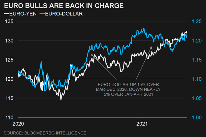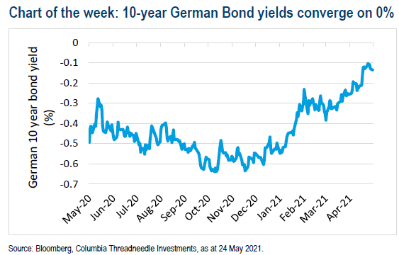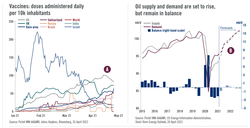 ”We see the ECB’s commitment to accommodative policy as supporting our pro-risk stance over the tactical horizon as the reopening broadens out. We upgraded our tactical view on European equities to neutral in February, and are seeing more reasons to be optimistic about this asset class for the next six to 12 months. Yet we see a risk that markets could misinterpret an operational decision to slow the pace of purchases as a more hawkish view on policy stimulus, and we would view any spread widening in euro area peripheral bonds in such an event as a buying opportunity”