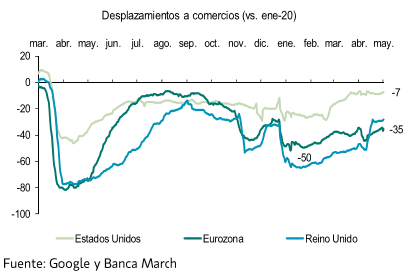 El hecho de que comience a verse la luz al final del túnel también se aprecia en la movilidad. En Estados Unidos, dona la mitad de la población ya ha recibido al menos una vacuna, los desplazamientos a comercios prácticamente ya se han normalizado a niveles previos a la pandemia. Así mismo, en Reino Unido, desde que se abrió el comercio no esencial (el 12 de Abril con la fase 2 de la desescalada), la movilidad se está recuperando a pasos agigantados.