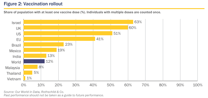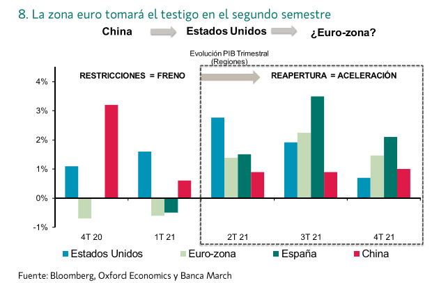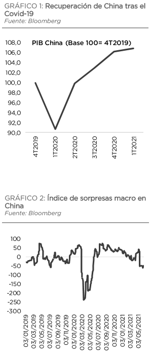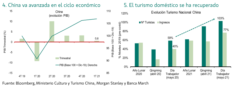 Donde primero se ha recuperado la actividad económica ha sido en China, que se encuentra en un periodo más avanzado del ciclo económico, con el PIB del primer trimestre del 2021 ya un 6% por encima de los niveles previos a la pandemia.
