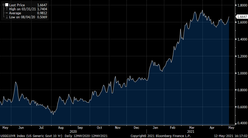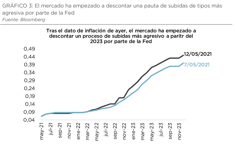 Siguiendo con Estados Unidos, ayer mereció la atención la publicación del Índice de Precios de Producción, que registró un crecimiento del 0,6% en abril que dejó la tasa interanual en el 6,2%. El dato es un reflejo de las tensiones de precios de materias primas y bienes intermedios que están soportando muchas empresas, y confirma el escenario inflacionista dibujado por la publicación del IPC el día anterior. La Reserva Federal continuó con su esfuerzo de comunicación, trasladando al mercado su convicción de que este rebrote inflacionista tendrá un carácter transitorio. La realidad es que esta vez el dato tuvo poco impacto en el rendimiento de los bonos del Tesoro americano.