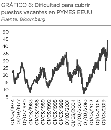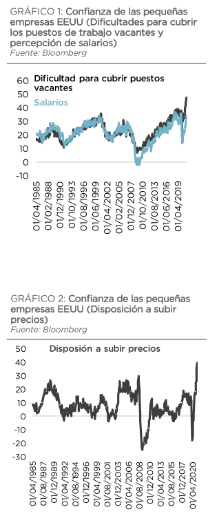 Esta semana hemos conocido algunas novedades que podrían suponer un riesgo a seguir viendo repuntes de inflación. Las pequeñas y medianas empresas cada vez tienen mayores dificultades para cubrir sus puestos de trabajo vacantes. El miércoles se publicó la confianza de las pequeñas empresas estadounidenses, cuyo registro de mayo registró cómo las dificultades para cubrir los puestos de trabajo vacantes siguen aumentando, de hecho el componente que mide esta variable marcó un nuevo máximo histórico, además la partida de los salarios también aumentó de manera significativa, situándose muy cerca del pico de la serie visto en Septiembre del 2018. Además los empresarios reflejaron una clara disposición a subir los precios de venta en los próximos meses.