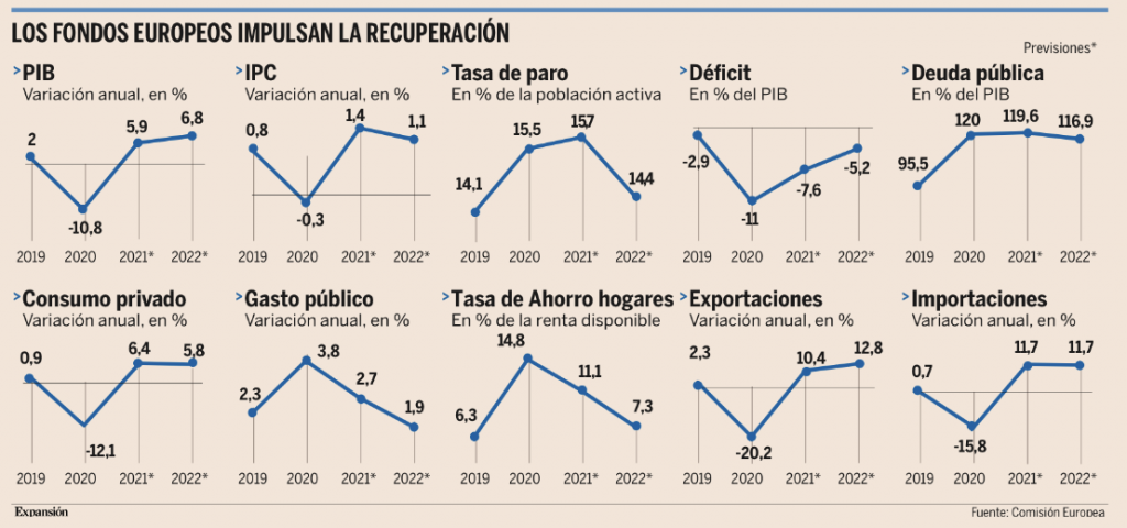 El miércoles por la tarde la Comisión Europea publicó sus nuevas previsiones macroeconómicas. Bruselas mejora su pronóstico del crecimiento del PIB español por el impacto de los fondos europeos, sobre todo en 2022. En cambio, el paro seguirá subiendo este año hasta el 15,7%
