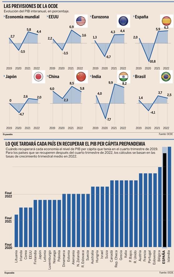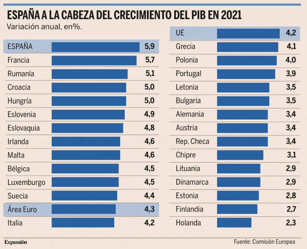 Este fuerte rebote llega después de que la economía española fuera la que más se desplomara en 2020 por el impacto del Covid-19, al sufrir un retroceso histórico del 10,8%. Ahora, la estimación coloca a España otra vez a la cabeza pero a la inversa, liderando el crecimiento de los 27 tanto en 2021 y 2022. En este mismo periodo, las estimaciones de la Comisión prevén que Alemania registre un crecimiento del 3,4% y un 4,1%, para Francia anotan un 5,7% y un 4,2%, mientras que en el caso de Italia, la otra gran economía europea que más golpeada se ha visto por el Covid, limita su crecimiento al 4,2% y al 4,4%.
