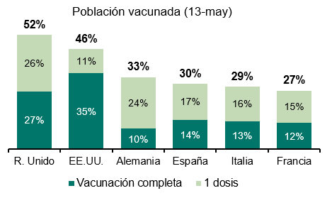 Reino Unido podría acelerar la inoculación de la segunda dosis (actualmente, 53% población inoculada con una dosis vs 26% pauta completa) ante la preocupación por la expansión de la variante india, al menos tan contagiosa como la de Kent que obligó al tercer confinamiento del que actualmente están saliendo.