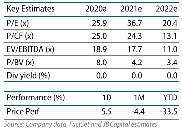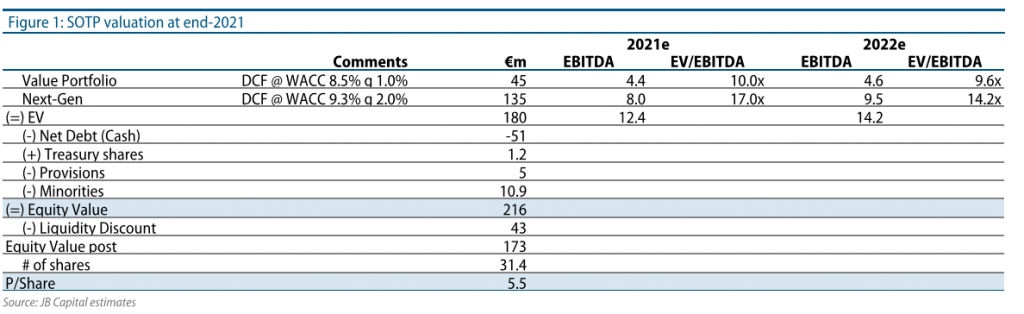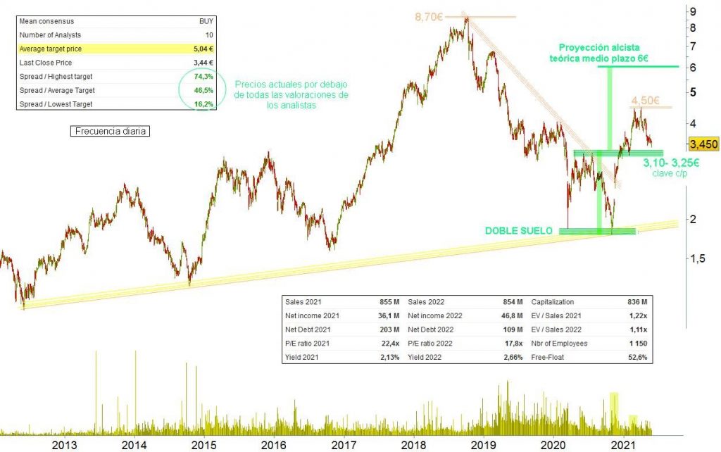 Pese a la subida que lleva la acción cotiza a 7x EV/EBITDA 2021 esperado frente a las 14x EV/EBITDA que cotizan sus comparables. La iliquidez de la compañía debería hacerle cotizar con cierto descuento, pero no con tantísimo.
