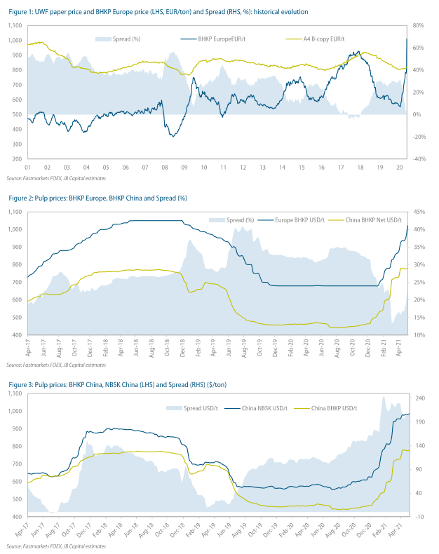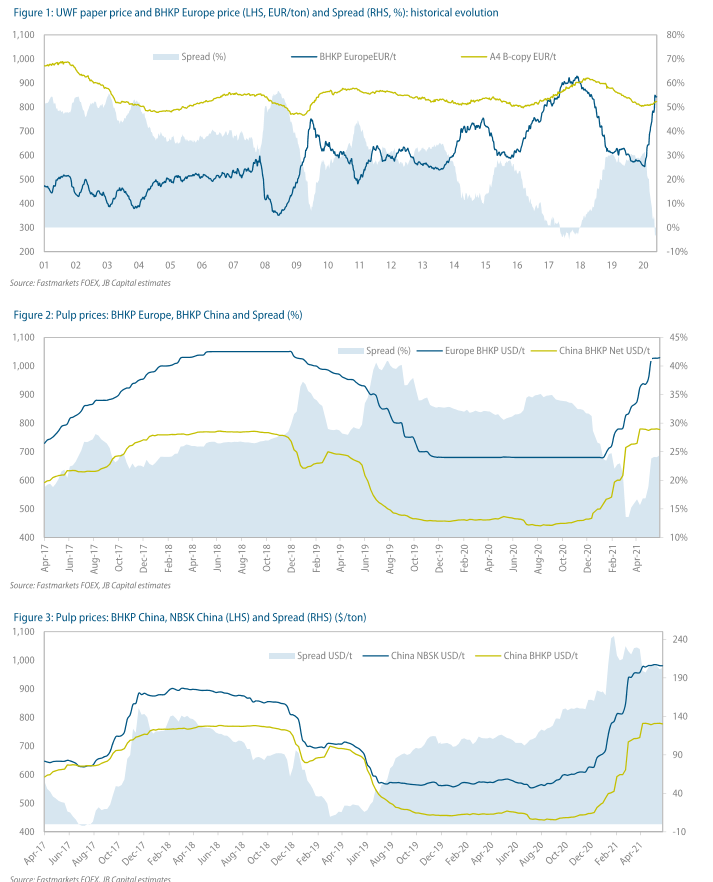 El precio de la pulpa ha subido un 7% en la última semana hasta 1.023$/tonelada (a 11 de Mayo), en China los precios han subido un 0,5% hasta los 779% la tonelada. En el año 2021 el índice BHKP de pulpa ha subido un 50%.
