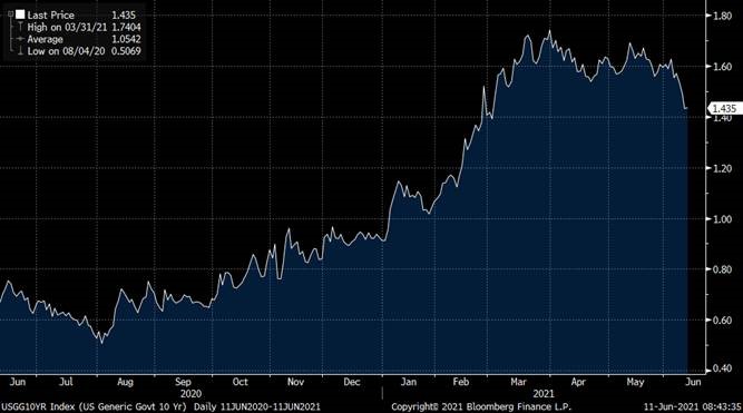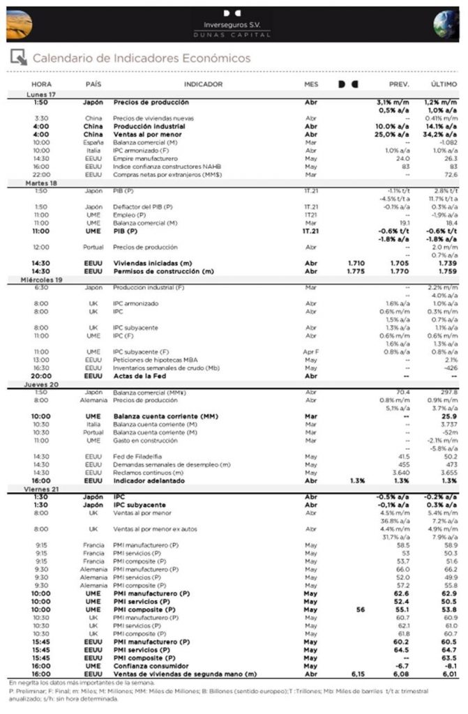Lo más llamativo de la semana fue el movimiento de la TIR del bono a 10 años americano acabó ayer retrocediendo a 1,43% (-6 pb), mínimos de tres meses, de la mano posiblemente de cierre de cortos, lo que sugeriría que el dato de inflación de ayer no sería suficiente para generar un discurso más tensionador de la Fed en su próxima reunión (16 de junio), y que probablemente habrá que esperar a agosto (Jackson Hole).