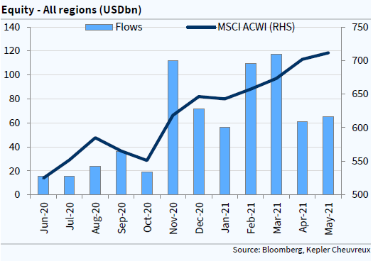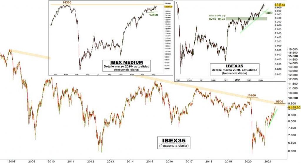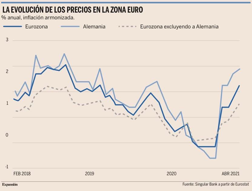 El detalle del PIB del 1T21 de la Eurozona publicado esta semana reveló una menor contracción del PIB (-0,3% intertrimestral) de lo inicialmente publicado (-0,6%) principalmente por un mejor comportamiento de la economía italiana que pudo evitar la recesión. Con todo, todavía se sitúa un -5% sobre el 1T19. No obstante, los indicadores adelantados de actividad continúan apuntando a una fuerte recuperación en el 2T21. La confianza de los inversores alemanes registró el mayor repunte de la valoración de la situación actual desde que comenzó a realizarse la encuesta en 1991. En la misma línea, la confianza de la pyme americana permaneció en niveles elevados, destacando el alza de las presiones inflacionarias (máximos desde 1980) y salariales, en un contexto de dificultad de cubrir las vacantes por la falta de personal cualificado. En relación a datos pasados, la producción industrial alemana pinchó en abril al retroceder un -1% mensual, situándose un -5% por debajo de abril del 2019. En Francia, el proceso de recuperación del sector exportador empieza a ganar velocidad (1,1% mensual, frente a abril del 2019 retrocede un -3,9% vs un -9% anterior). En Estados Unidos se redujo el déficit comercial en abril gracias al mayor dinamismo exportador (+1,1% mensual) lo que permite que frente a 2019 ya solo caiga un -2,5%, reflejo de que la recuperación global va ganando tracción. Muestra, los números de compra venta de viviendas en España, según el Colegio de Registradores se incrementó un +3% en relación a abril del 2019, con unos precios, que según el INE, han dejado de caer trimestralmente (+0,5% trimestral) aunque todavía sigue frenando el aumento en tasa interanual (+0,9% vs +1,5% anterior).