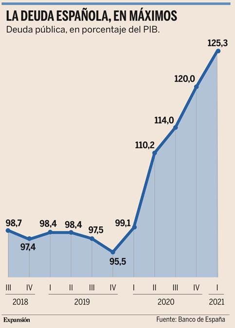 Aunque el mayor crecimiento nominal del PIB ayudará a reducir el cociente de deuda entre PIB, esta relación seguirá en el entorno del 120% en 2021 y cercano al mismo en 2022, que muestra una rebaja insuficiente, fiada sólo a la mejoría del PIB, puesto que el déficit seguirá estando presente y a niveles muy importantes, cercanos al 8%, de manera que la deuda seguirá creciendo en valores absolutos.
