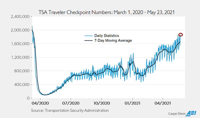 Sexto: se reactiva el sector turismo. El consumidor toma la decisión de reservar sus viajes cuando está vacunado, lo que provoca una recuperación exponencial del sector, ya que la entrega de vacunas es exponencial, no lineal (en marzo vacunábamos a un 0,2% de la población al día, ahora al 1%). A modo de ejemplo, el uso de aeropuertos por los norteamericanos se sitúa ya tan sólo un 27% por debajo de niveles pre-Covid (llegó a caer más de un 90%), tal y como se observa en el gráfico adjunto, y la evolución de reservas de avión con destino a España desde otros países de la UE o de reservas de destinos hoteleros españoles experimenta también una función exponencial, no lineal, como hemos venido publicando en diversos documentos, a medida que vacunamos a unos 60 millones de europeos al mes. Esta función exponencial ligada al ritmo de vacunación soporta la tesis de que la temporada turística presenta riesgos alcistas frente a lo descontado por el consenso.