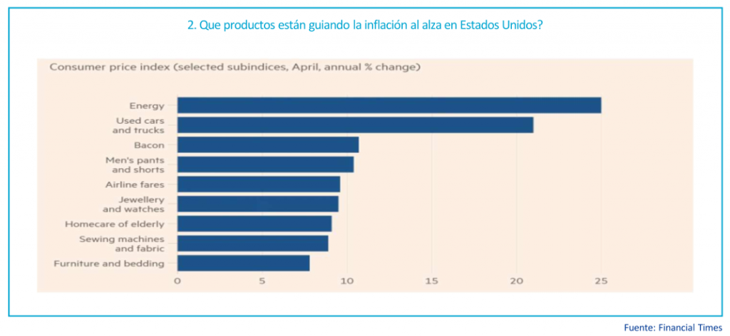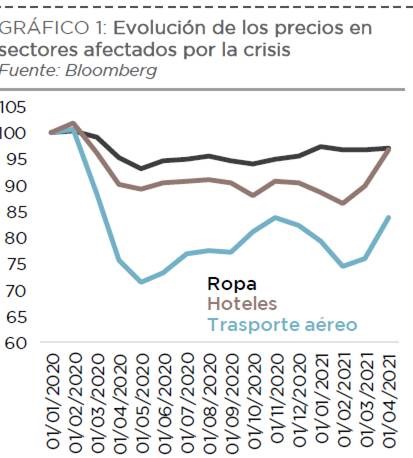 En la composición del dato de IPC se observó cómo la partida de energía tuvo una presencia muy relevante en el resultado final, con un incremento anual del 25,10%. En general, la práctica totalidad de los componentes del índice de precios al consumo mostraron un incremento de precios en el mes de abril, destacando los negocios más afectados por la pandemia que, con la reapertura, están normalizando precios, como es el caso de aerolíneas (+9,6% interanual) o los hoteles (+7,40% interanual).