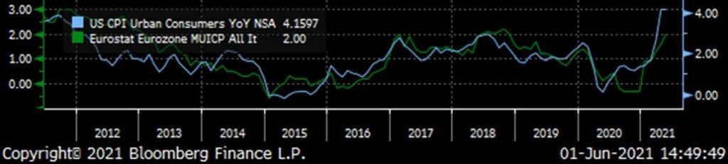 Ayer también se publicó el IPC de Mayo en Estados Unidos por encima de lo esperado por el mercado (5% Vs 4,7%). Los precios de mayo en Estados Unidos se saldaron con un incremento mensual del 0,6% en el índice general. En la referencia subyacente la subida fue incluso mayor, con un ascenso del 0,7%. De esta forma, en términos interanuales la referencia se situó en el 5,0% (Vs 4,7% esperado), mientras que exceptuando los componentes más volátiles, el avance fue del 3,8% (3,5% esperado), el mayor desde el año 1992. En la composición se pudo observar cómo la partida de energía tuvo una presencia muy relevante en el resultado final, con un incremento anual del 28,5%. En general, la práctica totalidad de los componentes del índice mostraron un incremento de precios en el mes de abril, destacando los negocios más afectados por la pandemia que, con la reapertura, están normalizando precios, como es el caso de las aerolíneas (+24,1% interanual) o los hoteles (+10% interanual). La referencia del IPC se sitúa en máximos del 2009. El avance del dato subyacente es especialmente relevante, al alcanzar máximos de los últimos 29 años. Debemos tener en cuenta que una parte de este movimiento se debe al efecto base positivo derivado de la caída de precios observada durante los primeros meses de la pandemia.