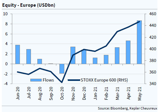 En Europa, se revelaron los planes para levantar todos los requisitos de cuarentena para los ciudadanos que estén totalmente vacunados o lleven una prueba negativa, a partir del 1 de julio. El PMI compuesto de la eurozona subió a 57,1 en mayo, frente a los 53,8 de abril, en línea con el consenso. Por otra parte, la UE anunció la emisión de 100.000 millones de dólares en bonos a largo plazo y de «decenas de miles de millones» en valores a corto plazo, a lo largo de este año, para financiar en parte las medidas de estímulo puestas en marcha para hacer frente a la pandemia.