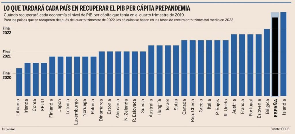 Es obvio que la economía española rebotará, dentro de la teoría del ciclo, pero lo importante, y he aquí el problema, es si será un rebote transitorio o si será estructural. Para que sea permanente, precisa de reformas estructurales, que permitan consolidar el brío de dicho rebote con la adecuación de la estructura española a un crecimiento económico más productivo, que es uno de los grandes problemas de la economía nacional y que origina otro gran problema, que es el elevado desempleo, tasa que la UE considera que se mantendrá elevada durante todo 2022.
