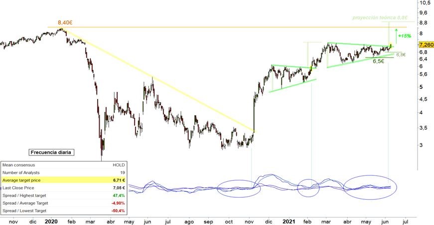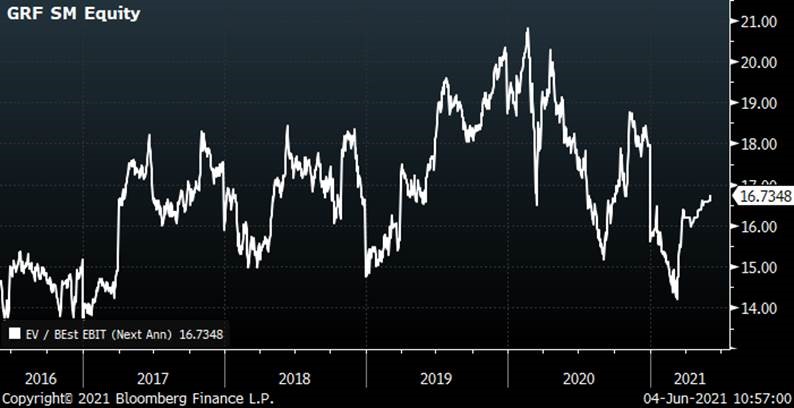 Las ventas de la compañía del 1T21 presentan una caída del -9%, algo mejor de lo esperado por el consenso de analistas que era de una caída del -9,5%. Sus ventas estuvieron impactadas por el tipo de cambio y por el Covid-19. El EBITDA se situó en 3.417 millones de euros (-9,1% reportado y +0,3% orgánico) estando por encima de lo esperado principalmente racias al negocio de Reino Unido y de España. El FCF 1T21 quedó también por encima de lo esperado en 33 millones de euros aunque no se traslada a mayor reducción de Deuda Financiera Neta de lo esperado, situándose esta en 35.796 millones de euros (-6,4% interanual y +1,6% intertrimestral). A pesar de que en 2021 la acción ha subido un +21% (+10% vs IBEX y +7% vs sector), aún está un -31% por debajo de niveles pre-Covid’19 en febrero del 2020 (vs -1% sector y -9% IBEX). La acción está al nivel al que compramos nuestra posición para la SICAV (en torno a los 4 euros), sigue teniendo un gran pòtencial a nuestro precio objetivo de medio plazo que está en torno a 5,5 euros por acción (potencial del 38%).