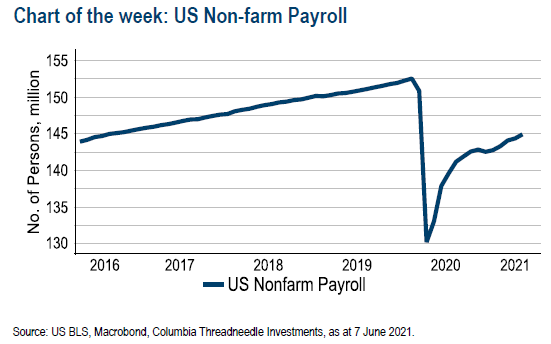 Estados Unidos: Mercado Laboral Aún Débil para Ser Inflacionario. La creación de empleo se ha acelerado en mayo, gracias al buen ritmo de vacunación, pero sigue por debajo de lo esperado: se crearon 559.000 empleo y se esperaban 100.000 más. La tasa de desempleo fue algo mejor de lo esperado (5.8%), pero se debió a una menor participación en el mercado laboral provocada por las ayudas al desempleo (los 300 dólares/semana adicionales se acaban en septiembre y 25 Estados ya lo han eliminado). El dato reduce el riesgo de un endurecimiento prematuro de la política monetaria por parte de la Reserva Federal y el USD se depreció tras el dato.