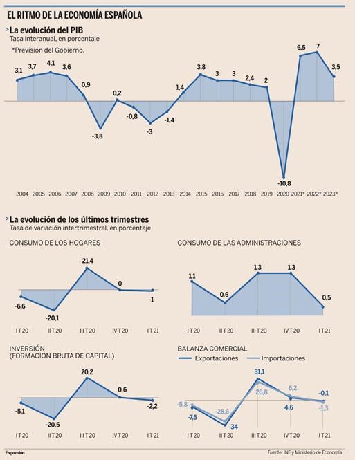 No obstante, las previsiones comunitarias son menos optimistas que las que ha recogido el Gobierno de Pedro Sánchez en su Programa de Estabilidad enviado a Bruselas la semana pasada. Las proyecciones de Moncloa apuntan a un crecimiento del 6,5% este año y del 7% en 2022, muy por encima de las lanzadas el miércoles por brazo ejecutivo de la UE.