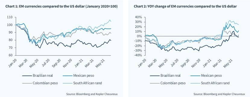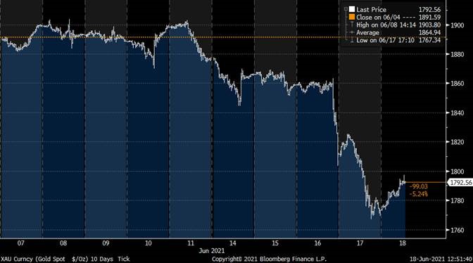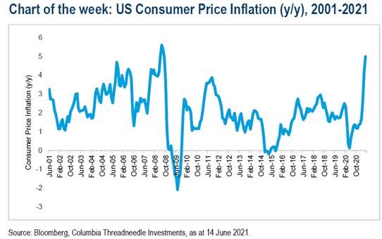 Los rendimientos de los Estados Unidos están ahora cerca del nivel más bajo desde finales del primer trimestre de 2021 y la preocupación por la inflación ha disminuido al menos un poco; con las tasas de inflación de equilibrio ahora muy lejos de los recientes máximos alcanzados a mediados de mayo. La inflación es, por supuesto, el «tema del día» en los mercados y, con esto en mente, la publicación de la inflación de los precios al consumidor fue el evento económico clave de la semana pasada. Se produjo después de un informe en abril (4,1% interanual). En mayo, los precios de consumo aumentaron un 0,6% más, lo que situó la tasa anual en el 5,0%. Mientras tanto, la lectura fue del 0,7% m/m o del 3,8% interanual. Como gran parte de estas «malas noticias» ya se habían descontado, los rendimientos no subieron al conocerse la noticia. La Reserva Federal de EE.UU. ha señalado que espera que la inflación aumente a corto plazo, pero que sea un fenómeno transitorio.