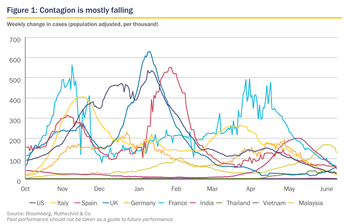 Los casos de coronavirus llevan descendiendo 6 semanas y el número de nuevos casos en la semana del 6 de Junio fue el menor desde mediados de Marzo. Además ya se han puesto más de 2.000 millones de vacunas en todo el mundo, 14% de las cuales en Estados Unidos, 11% en India y 3% en Reino Unido.