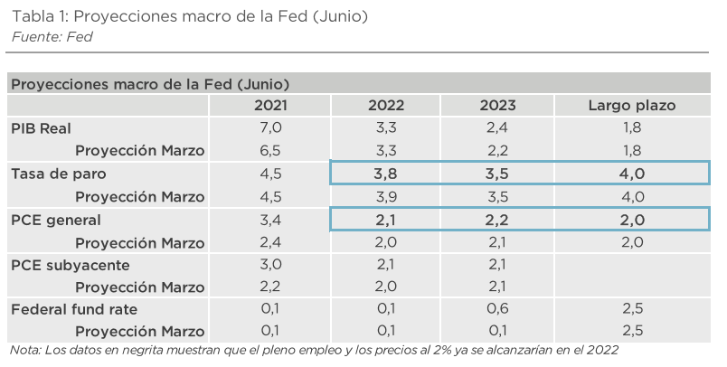 Las nuevas proyecciones económicas de la Fed apuntan a un crecimiento del PIB del 7% este año, cuando el pasado marzo esperaba que fuera del 6,5%. Las estimaciones de pleno empleo se mantienen: se espera que el porcentaje de desempleo caiga por debajo del 4,5%. En este contexto, la Fed espera que la inflación subyacente esté en 2021 en el 3%, muy por encima del 2,2% que preveía en en marzo. Para 2022, estima que el IPC ronde el 2,1%.