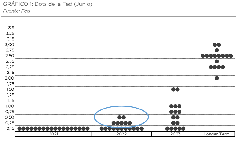 El banco central de Estados Unidos decidió el miércoles mantener los tipos de interés en el rango mínimo de 0% a 0,25%, donde permanecen desde el inicio de la pandemia. En marzo, los miembros de la Fed predijeron que los tipos de interés se mantendrían como están, al menos hasta 2024, pero ahora el consenso adelanta la fecha un año, lo que indica que la Fed espera una transición más rápida hacia una recuperación económica total, lo que acompañara con una política monetaria más ajustada.
