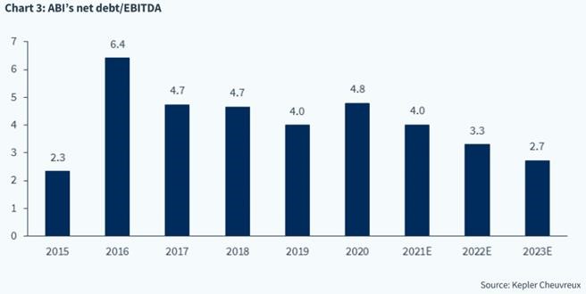 Los analistas de Kepler estiman que la fortaleza de las divisas de los mercados emergentes tendrá un impacto de entre el 3% y el 4% en el EBITDA del 2022 e incluso superior en el EBITDA del 2023. La recuperación de los ingresos de AB InBev después de la pandemia y la más que favorable evolución de las divisas emergentes harán que el balance de la compañía tenga un fuerte desapalancamiento hasta alcanzar un múltiplo de 2,7x EBITDA en 2023.