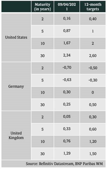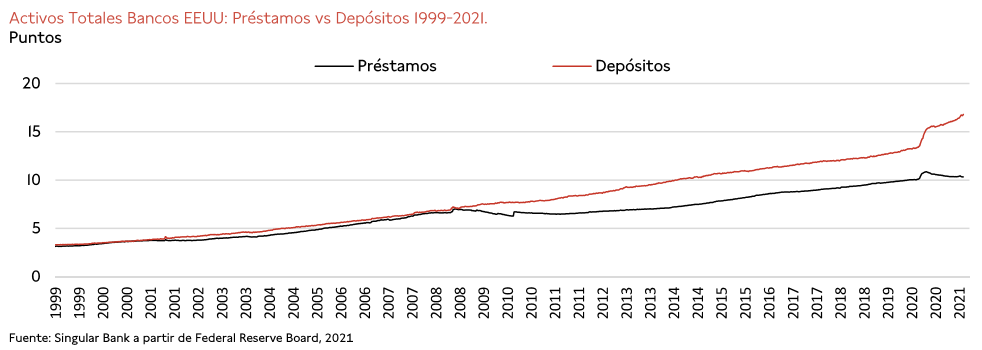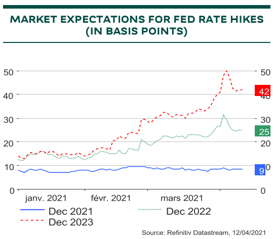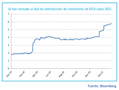 La Fed y los analistas consideran que el crecimiento será muy fuerte en este año en Estados Unidos, algunos miembros de la Fed querrían que se redujesen lentamente las compras de activos por parte del banco central (tapering) aprovechando el fuerte crecimiento de la economía, la caída del desempleo y los riesgos de inflación actuales. La Fed, en su conjunto, considera que la presión inflacionaria será transitoria y que no hará subir los tipos ni este año ni en los dos próximos (2022 ni 2023). Aunque el mercado no se cree este mensaje y espera la primera subida de tipos para Diciembre del 2022.