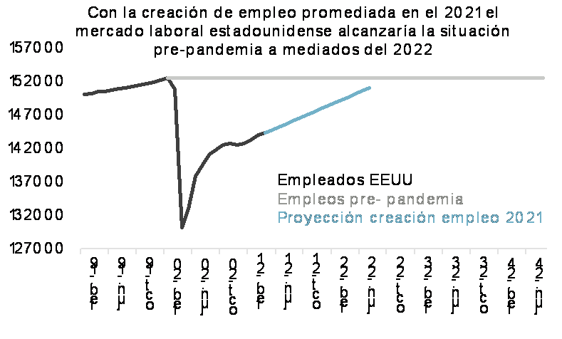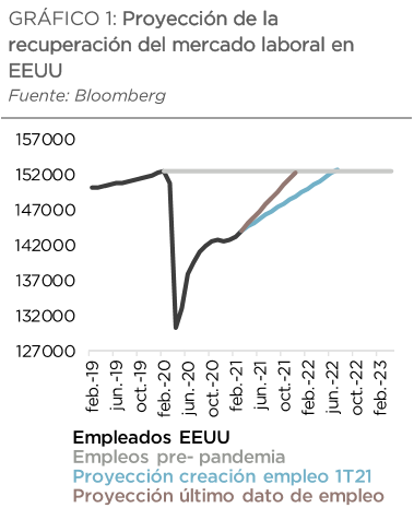 Lo que suceda en el medio y largo plazo seguirá dependiendo principalmente del mercado laboral y las implicaciones de este sobre los salarios. En lo que al primer punto se refiere, el dato de paro de abril del viernes fue bastante más débil de lo que se esperaba, con una creación de 266.000 puestos de trabajo frente a la estimación de 1 millón, lo que puso de manifiesto cierta dificultad del sector privado para atraer a trabajadores. A pesar de ello, se refleja una progresiva recuperación, en la medida que el avance en el programa de vacunación sigue posibilitando la normalización paulatina de la economía. De esta manera, Estados Unidos ya habría recuperado un 37% del empleo perdido durante la crisis del Covid-19. Además, de mantener la dinámica observada a lo largo de este año, podríamos alcanzar los niveles de empleo que había en el 2019 para mediados del 2022.