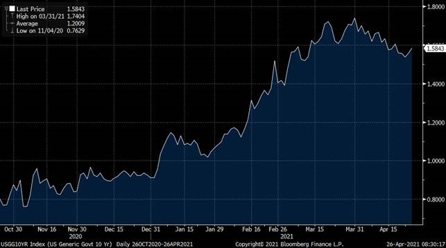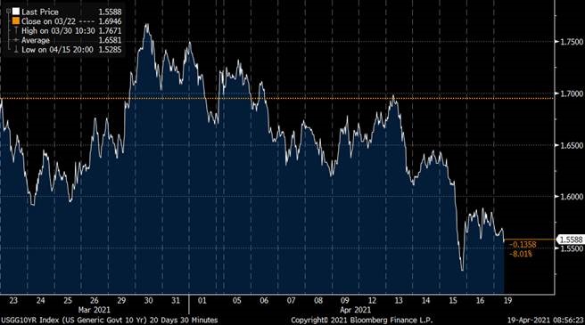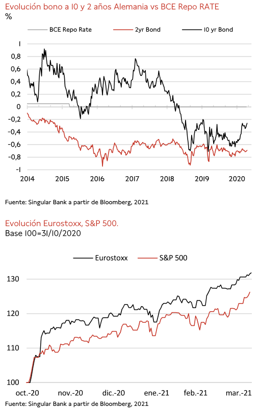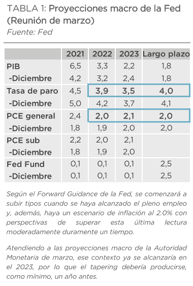 En su reunión del miércoles la Reserva Federal americana no realizó cambios significativos en su comunicado más allá de reconocer el mayor dinamismo de la actividad y de la inflación, aunque remarcó la transitoriedad de esta última. Mientras, Powell volvió a insistir en su comunicado que todavía no es momento para discutir un posible tapering (rebajar los paquetes de compra de activos). La Fed compra deuda a un ritmo de 80.000 millones de dólares mensuales en deuda y 40.000 millones de dólares en MBS y según la previsión media de tipos de interés de sus miembros en la reunión de marzo no subirá los tipos hasta 2024.